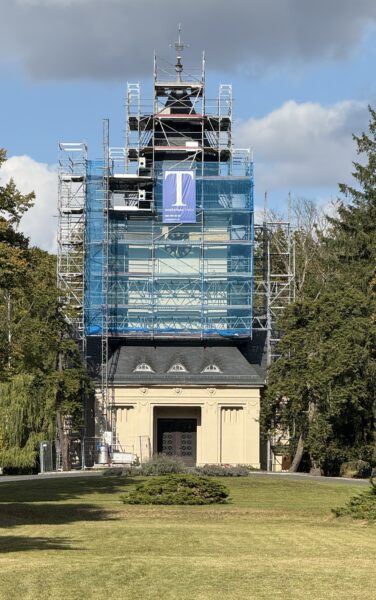 Aufwendiges, freistehendes Stützgerüst für das Wetterschutzdach – keine Verankerung im Gebäude.