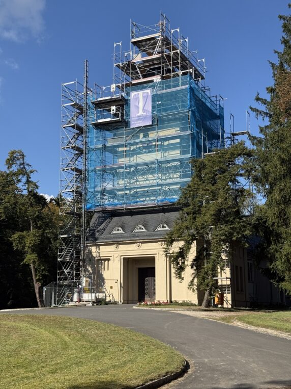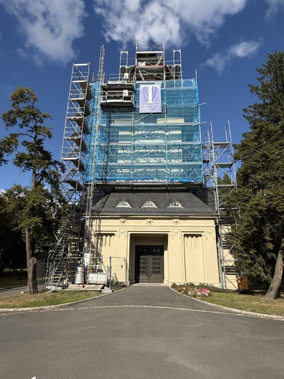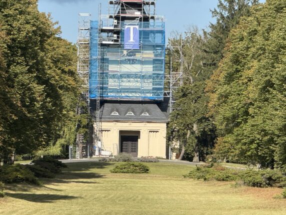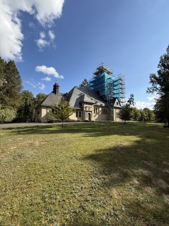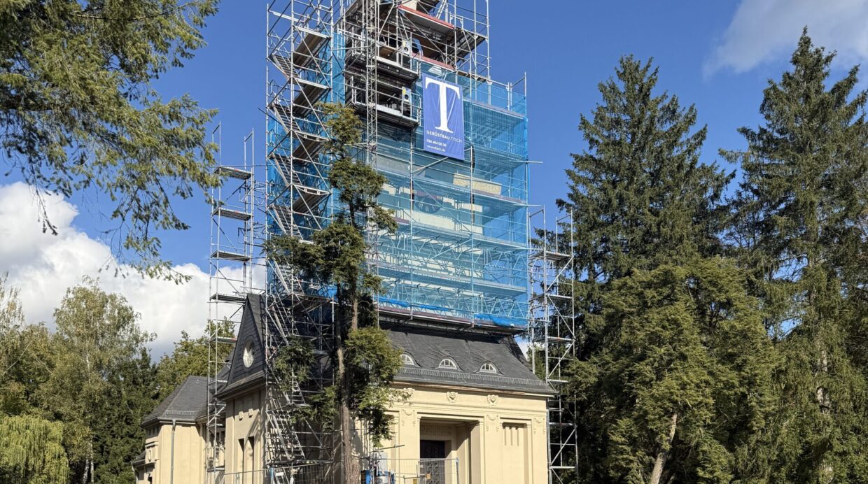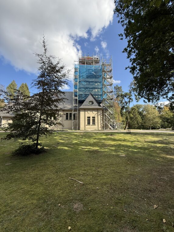 Mit Rahmengerüsten entstand eine freistehende Sonderlösung ohne Verankerungen am Gebäude. Aus Rücksicht auf die Friedhofsgemeinde, fanden die Gerüstarbeiten ausschließlich außerhalb der Kapellennutzung durch die Gemeinde statt.